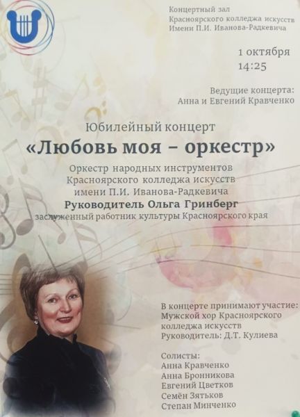 1 октября в «День музыки» в Красноярском колледже искусств им.П.И.Иванова-Радкевича состоялся юбилейный концерт «Любовь моя - оркестр». В исполнении оркестра народных инструментов ККИ им. П.И. Иванова-Радкевича под управлением заслуженного работника Красноярского края Ольги Гринберг.