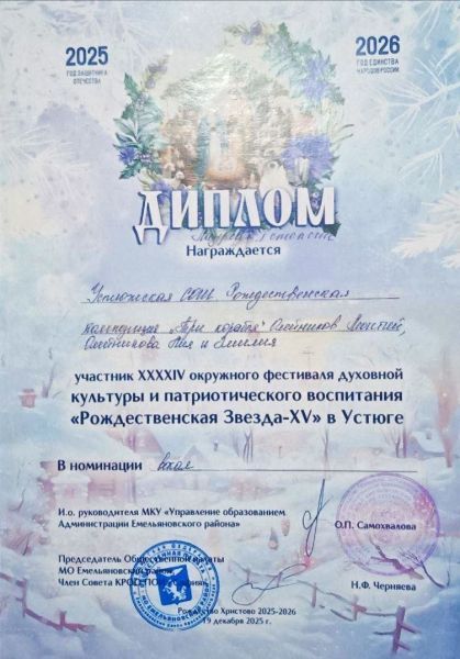 19 декабря в Устюжской общеобразовательной школе прошел фестиваль-конкурс «Рождественская звезда». В нём приняла участие семья Олейниковых – Эмиия, и, уже наши выпускники Леонтий и Лия, ученики Юрченко Светланы Петровны.